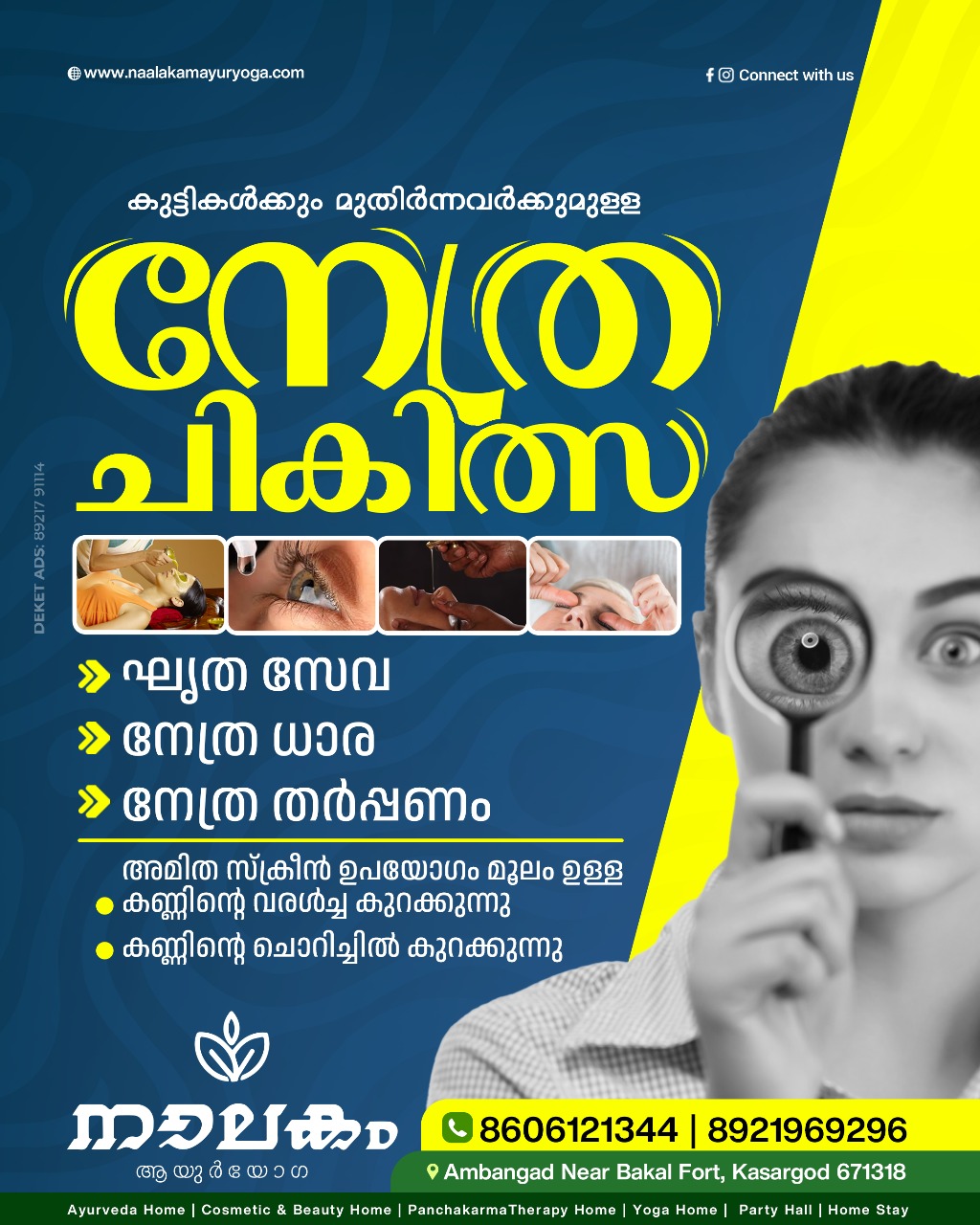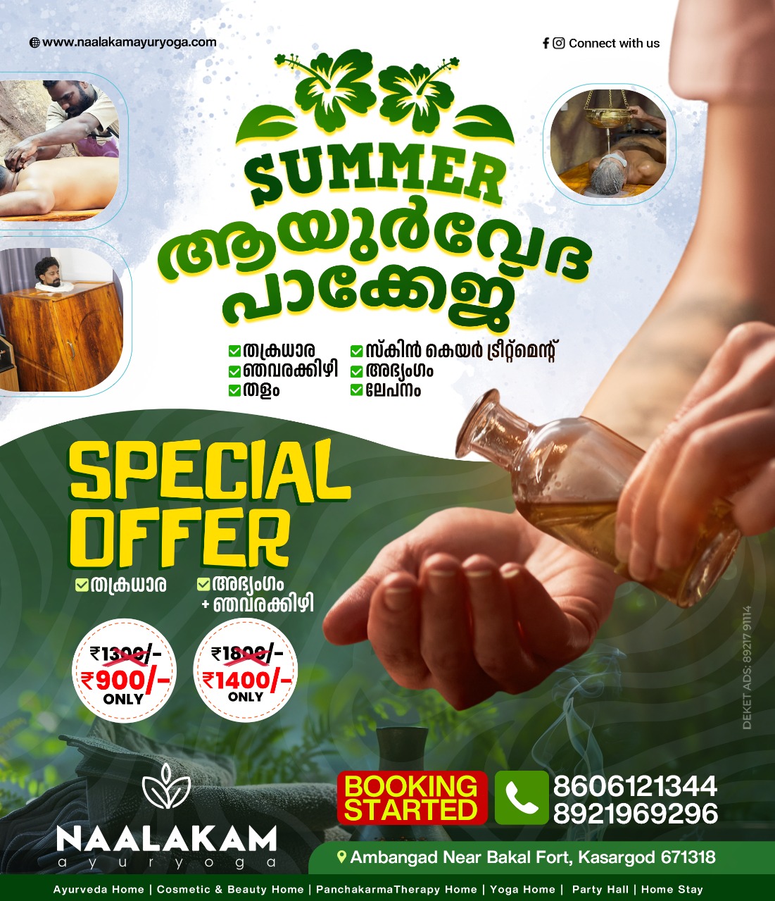 Naalakam Ayuryoga is an ecofriendly ayurvedic and yoga home at Ambangad, near Bekal Fort in the picturesque backdrop of Panayal village, Kasaragod district, Kerala. Naalakam ayuryoga is providing the authentic and traditional Ayurveda and Yoga therapy with modern perspective with homely pleasants.